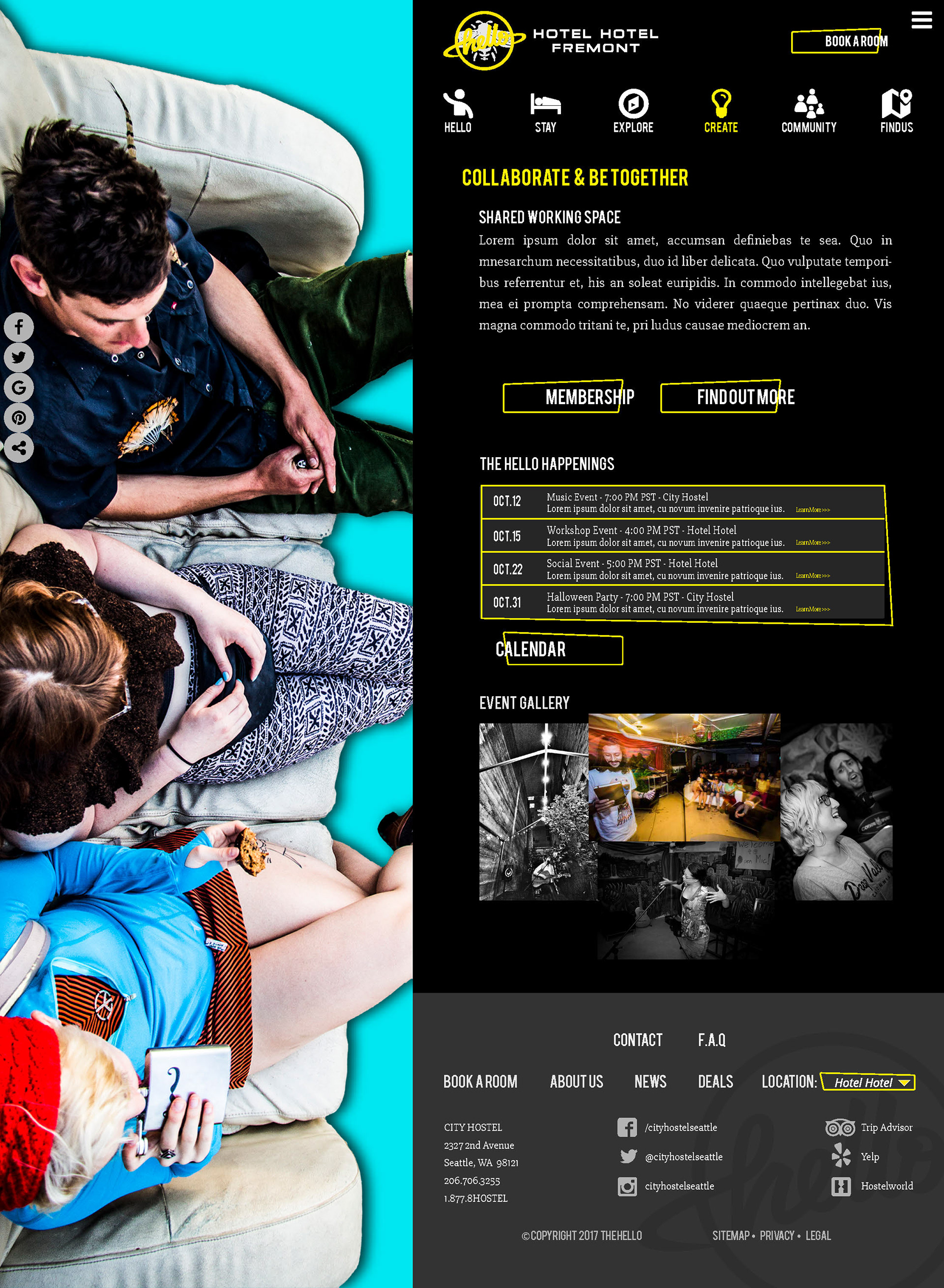 New design options for the Seattle-based hostel company, Hello, drew inspiration from the hostel's refreshed brand palette of black and yellow and alternative/grunge aesthetics.